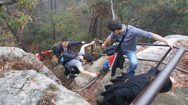 到達目的地用過午餐,全體成員便整裝待發(fā),完成此次拓展訓練最艱難的項目--攀登天屏峰。天屏峰海拔高度1605米,山峰險峻、陡峭無比,全路段多為樹根、石塊堆出的小道,多處攀爬必須手腳并用,甚至要靠隊友幫助,攀登而上極為挑戰(zhàn)體能。