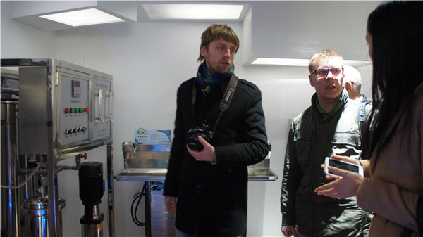 在榮事達(dá)家電研發(fā)中心二樓展廳,色彩紛呈、形態(tài)各異的凈水產(chǎn)品引得許多乘客注目凝視。出于對自動(dòng)售水機(jī)的好奇,考察團(tuán)許多成員一進(jìn)門便被吸引過去,通過介紹,他們紛紛夸這個(gè)大家伙方便好用。看到精致漂亮的“梅、蘭、竹、菊”純水機(jī)時(shí),兩名俄羅斯女士不禁用英語單詞“nice”表達(dá)了自己的喜愛之情。