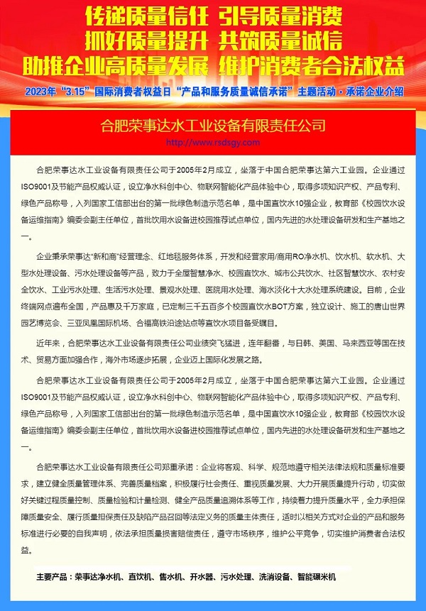 - 榮事達(dá)水工業(yè)公司自2014年起開始推出“參觀工廠,健康飲水”活動,消費(fèi)者通過參觀工廠,可以親臨公司生產(chǎn)一線,見證產(chǎn)品生產(chǎn)過程;參觀凈水展廳,聆聽凈水知識講解;品嘗現(xiàn)制凈水,感受產(chǎn)品實(shí)際效果。 - 參觀活動開展以來,廣受消費(fèi)者歡迎,吸引了全國各地消費(fèi)者參觀考察,接待人次超過30萬。 - 參觀工廠 健康飲水 - 近日,榮事達(dá)水工業(yè)公司“參觀工廠”熱力持續(xù)增高。來自全國的一批批消費(fèi)者,走進(jìn)智慧水世界展廳、榮事達(dá)商用設(shè)備生產(chǎn)車間、榮事達(dá)智能家用凈水生產(chǎn)車間實(shí)地參觀,全面了解公司發(fā)展規(guī)模及產(chǎn)品布局。 - 在智慧水世界展廳,許多消費(fèi)者饒有興趣地體驗(yàn)了榮事達(dá)智能家用凈水機(jī)、步進(jìn)式直飲機(jī)、自助售水機(jī)等全系列凈水產(chǎn)品,并對產(chǎn)品創(chuàng)新功能、卓越的產(chǎn)品品質(zhì)以及“私人定制”研發(fā)服務(wù)深表贊賞。      - 榮事達(dá)水工業(yè)公司“參觀工廠”活動讓消費(fèi)者更直觀地了解凈水產(chǎn)品,也更有利于普及飲水安全知識,推廣凈水,讓更多人喝上安全水!消費(fèi)者紛紛表示,工廠之行受益匪淺,回去之后將改進(jìn)飲水方式,為自己和家人創(chuàng)造更為健康的飲水條件。 - 見證品質(zhì) 共筑誠信 - 榮事達(dá)水工業(yè)公司開展的“參觀工廠,健康飲水”活動,來自于對自身良好品牌形象及卓越產(chǎn)品品質(zhì)的自信。 - 在中國質(zhì)量檢驗(yàn)協(xié)會主辦的2023年“3.15”產(chǎn)品和服務(wù)質(zhì)量誠信承諾的主題活動中,榮事達(dá)憑借過硬的實(shí)力,獲得協(xié)會以及權(quán)威專家的一致認(rèn)可,榮膺“全國凈水行業(yè)質(zhì)量領(lǐng)先品牌”“全國產(chǎn)品和服務(wù)質(zhì)量誠信示范企業(yè)”“全國質(zhì)量檢驗(yàn)穩(wěn)定合格產(chǎn)品”“全國消費(fèi)者質(zhì)量信譽(yù)保障產(chǎn)品”多項(xiàng)榮譽(yù)。     - ☆ 《中國質(zhì)量網(wǎng)》 - http://www.chinatt315.org.cn/act/wcrd2023/76966.html - ☆ 《中國經(jīng)濟(jì)網(wǎng)》 - http://12365.ce.cn/wcrd2023/76966.html - ☆ 《中國產(chǎn)品質(zhì)量信譽(yù)網(wǎng)》 - http://www.c315.cn/wcrd2023/76966.html  - 榮事達(dá)水工業(yè)公司將繼續(xù)做好產(chǎn)品和服務(wù),以質(zhì)量和口碑促進(jìn)品牌魅力的持續(xù)提升,為更多消費(fèi)者健康飲水提供優(yōu)質(zhì)服務(wù)。
