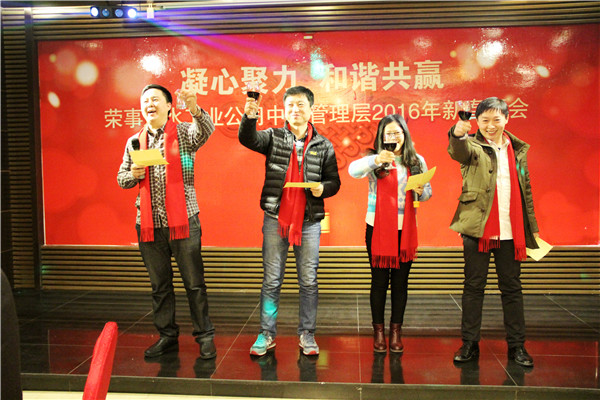 酒會(huì)上,雷鳴董事長(zhǎng)作了重要講話,向全體中高管理層成員拜年,感謝全體成員一年來(lái)為公司發(fā)展辛苦的付出與努力,并希望新的一年大家共同努力,讓公司繼續(xù)大展宏圖、欣欣向榮。之后,各分公司、事業(yè)部、部門(mén)紛紛以創(chuàng)新、幽默、多樣的方式向全體參會(huì)人員拜年。生產(chǎn)制造中心以喜慶的春聯(lián)為依托,在表達(dá)新春祝福的同時(shí),還帶來(lái)了印有“安全第一 質(zhì)量為本”字樣的員工集體簽名橫幅,為確保產(chǎn)品質(zhì)量作出承諾;凈水家電事業(yè)部總經(jīng)理王悅生的現(xiàn)場(chǎng)即興題字,用丹青妙筆表達(dá)了其部門(mén)成員奮勇?tīng)?zhēng)先的目標(biāo)和信心;工程事業(yè)部總經(jīng)理劉東帶領(lǐng)其部門(mén)成員所采用的“三句半”拜年方式贏得了滿堂喝彩;財(cái)務(wù)部與企劃部共同合作的“異口同聲”有獎(jiǎng)競(jìng)猜創(chuàng)意拜年,更是傳達(dá)了“榮事達(dá)一家親”的美好寓意。
