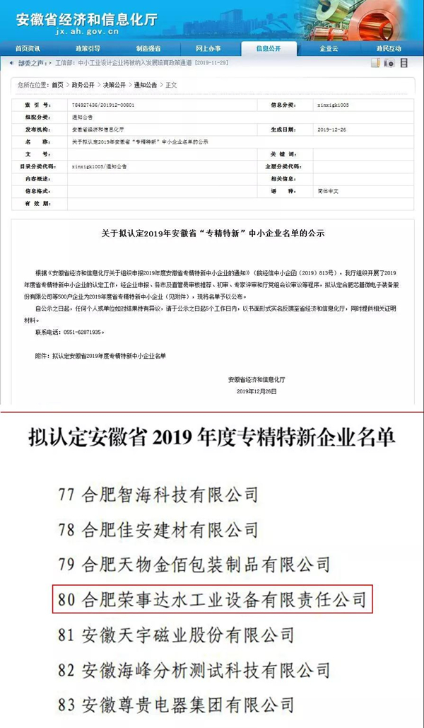 - 12月26日,安徽省經(jīng)濟(jì)和信息化廳公布了2019年安徽省“專精特新”企業(yè)名單,合肥榮事達(dá)水工業(yè)設(shè)備有限責(zé)任公司憑借在專業(yè)化、精細(xì)化、特色化和創(chuàng)新化方面的獨(dú)特優(yōu)勢成功入選。