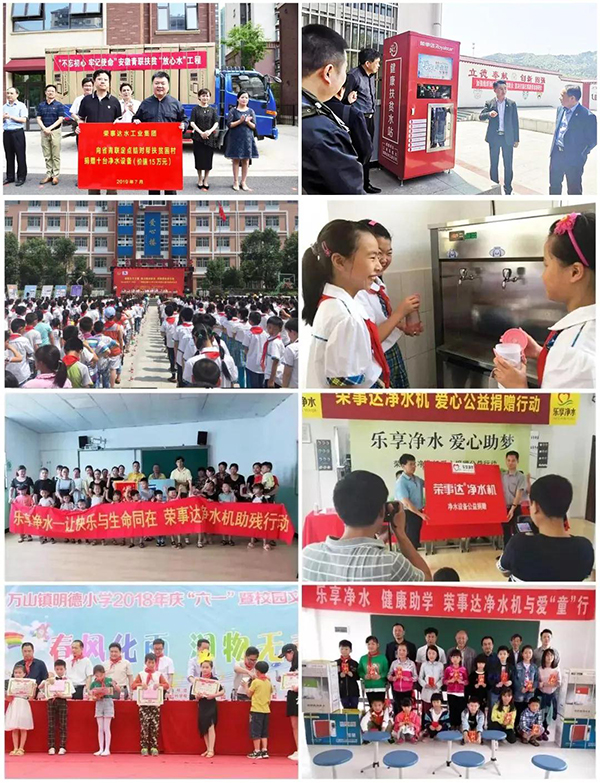 榮事達(dá)水工業(yè)從事凈水行業(yè)十余年,始終堅(jiān)守企業(yè)發(fā)展與公益事業(yè)同趨共行。榮事達(dá)自2010年發(fā)起“樂享凈水”公益行動(dòng),在全國(guó)范圍內(nèi)開展“健康助學(xué)”、“愛心助殘”、“愛心敬老”等各類公益幫扶,捐贈(zèng)、安裝凈水設(shè)備數(shù)千套;向全國(guó)首個(gè)希望小學(xué)——金寨希望小學(xué)捐贈(zèng)直飲水設(shè)備,并聯(lián)合金寨希望公益服務(wù)中心及地方公益協(xié)會(huì)共同發(fā)起“給山區(qū)孩子一杯水”——援建金寨中小學(xué)凈水設(shè)備公益活動(dòng),向金寨縣全縣中小學(xué)援建直飲水設(shè)備400多套,該項(xiàng)目也被評(píng)為“安徽省十佳學(xué)雷鋒志愿服務(wù)項(xiàng)目?jī)?yōu)秀典型”;攜手中華少年兒童慈善救助基金會(huì)發(fā)起成立“健康飲水專項(xiàng)基金”,開展各類校園飲水健康保障工作;攜手安徽?qǐng)F(tuán)省委、省青聯(lián)啟動(dòng)“青力扶貧聯(lián)創(chuàng)夢(mèng)想”健康扶貧“放心水”工程,向安徽地區(qū)多個(gè)貧困村捐贈(zèng)凈水設(shè)備,建立健康扶貧水站等。