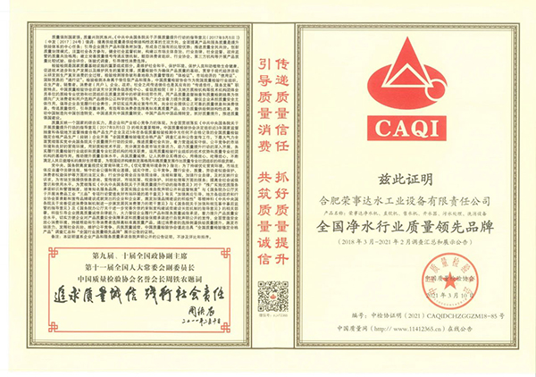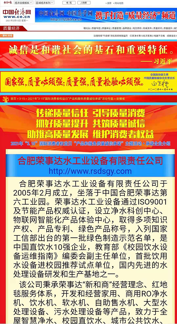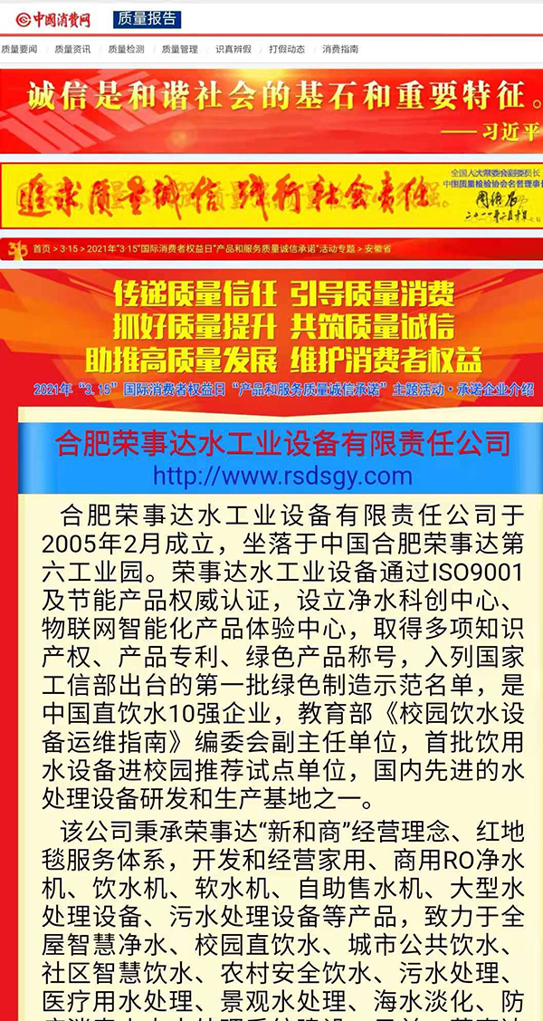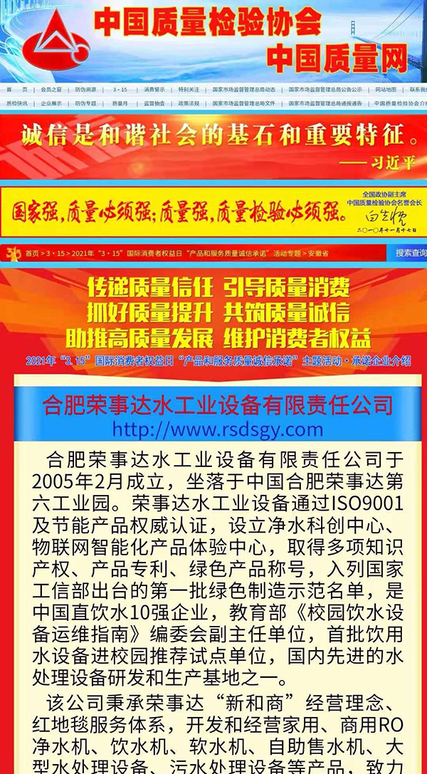 共筑質(zhì)量誠信,引導(dǎo)質(zhì)量消費。在由中國質(zhì)量檢驗協(xié)會主辦的2021年“3.15”產(chǎn)品和服務(wù)質(zhì)量誠信承諾的主題活動中,榮事達憑借卓越的產(chǎn)品品質(zhì)及良好的社會形象,獲得協(xié)會以及權(quán)威專家的一致認(rèn)可,榮膺 “全國產(chǎn)品和服務(wù)質(zhì)量誠信示范企業(yè)”“全國質(zhì)量信得過產(chǎn)品”“全國凈水行業(yè)質(zhì)量領(lǐng)先品牌” “全國質(zhì)量誠信先進企業(yè)”多項榮譽,《中國質(zhì)量報》、《中國消費者報》及中國質(zhì)量網(wǎng)、中國經(jīng)濟網(wǎng)、中國消費網(wǎng)等多家媒體均予以集中展示和公告。
