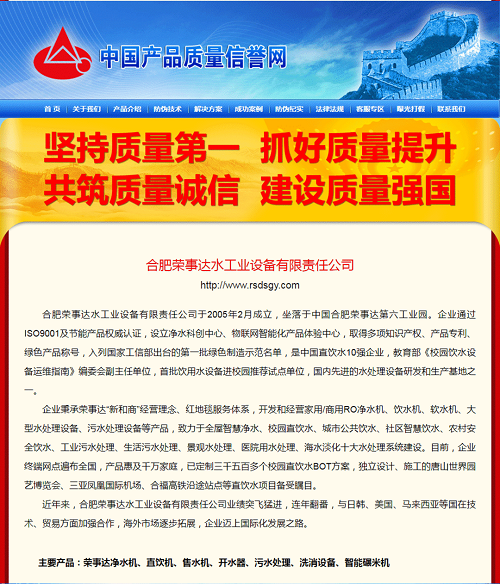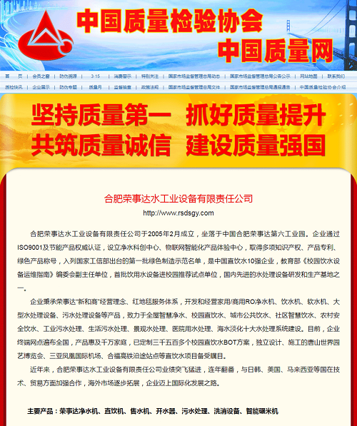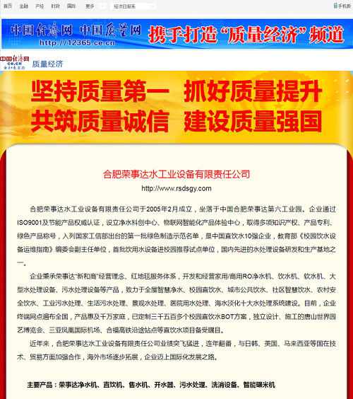 榮事達水工業(yè)集團積極響應(yīng)全國“質(zhì)量月”活動,彰顯企業(yè)的社會責(zé)任和擔(dān)當(dāng),面向全國用戶做出相關(guān)產(chǎn)品和服務(wù)質(zhì)量誠信承諾,一舉拿下五項殊榮,相關(guān)承諾和獲獎情況已在《中國質(zhì)量網(wǎng)》《中國經(jīng)濟網(wǎng)》《中國產(chǎn)品質(zhì)量信譽網(wǎng)》在線發(fā)布。
