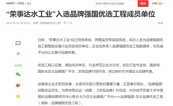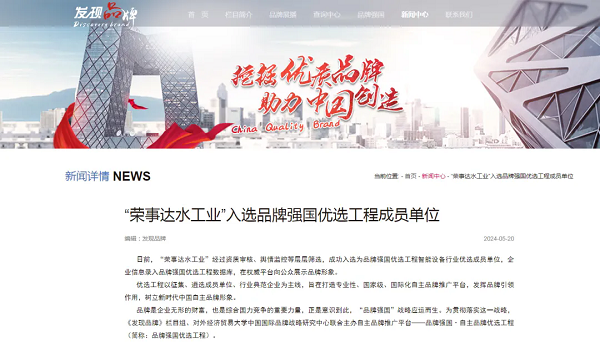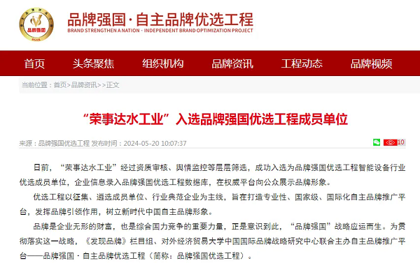 日前,“榮事達水工業(yè)”經(jīng)過資質(zhì)審核、輿情監(jiān)控等層層篩選,成功入選為品牌強國優(yōu)選工程智能設備行業(yè)優(yōu)選成員單位,企業(yè)信息錄入品牌強國優(yōu)選工程數(shù)據(jù)庫,在權(quán)威平臺向公眾展示品牌形象。