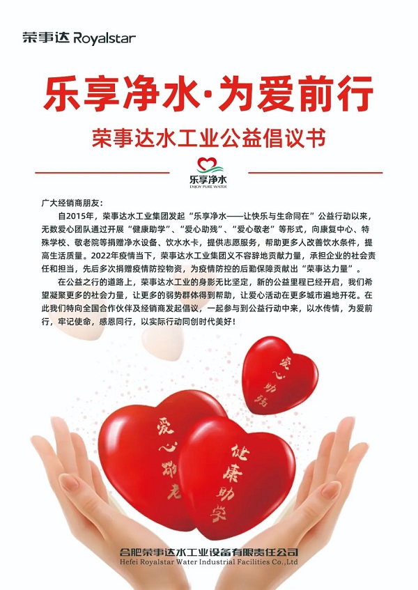03 榮事達(dá)水工業(yè)經(jīng)銷商積極響應(yīng)集團(tuán)公益倡議,熱衷于健康助學(xué)、愛心敬老、愛心助殘、疫情防控等多種形式的公益行動(dòng),截止到目前,經(jīng)銷商們的公益活動(dòng)已遍及安徽、南京、湖南、江蘇、陜西、江西、河南、河北等多個(gè)地區(qū),以健康好水,溫暖每一個(gè)城市。