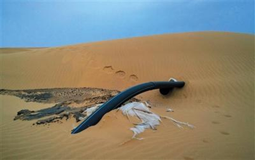 記者看到,每個(gè)排污池都有一個(gè)到數(shù)個(gè)白色“玻璃鋼夾砂”管道通向沙漠,方向指向工業(yè)園。在排污池和化工園區(qū)之間的一公里多都是沙漠,記者從排污池向化工園區(qū)方向行走,不時(shí)可以看見(jiàn)暴露在外面的排污管道,在一些洼地,還可以看到一些直接向下插入沙土里的黑色橡膠管道,這些管道周邊的細(xì)沙呈黑色。踢開(kāi)表面,下面是黑色泥漿般的凝結(jié)物,發(fā)出一股惡臭味。