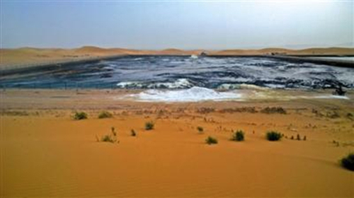 騰格里沙漠遭工業(yè)污染 管道插沙中散發(fā)著惡臭