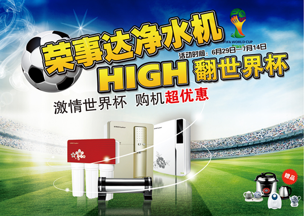 全世界共襄的足球大戲已經(jīng)拉開戰(zhàn)幕,四年一度的王者之戰(zhàn)正趨于激烈。為回饋廣大消費(fèi)者對榮事達(dá)凈水機(jī)一貫的支持與厚愛,值巴西世界杯之際,榮事達(dá)凈水機(jī)將于2014年6月29日至7月14日面向全國開展“High翻世界杯”活動?;顒悠陂g,榮事達(dá)凈水機(jī)將在各地開展一系列世界杯主題讓利活動,為在南美鏖戰(zhàn)的足球英雄們搖旗吶喊!